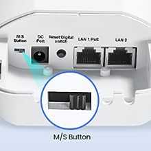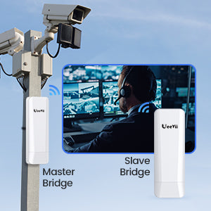 Master bridge or the slave bridge mode of the wireless bridge can be switched by the M/S button; In point-to-point applications, one of the bridges is used as the master bridge, and the other bridge is used as the slave bridge to achieve the wireless transfer function. UeeVii wireless bridge will be pre-paired with 2 bridges, you can connect other devices to use.